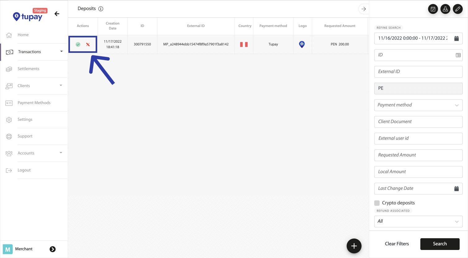 En el ambiente de STG tienen la posibilidad de probar el flujo completo tras completar o cancelar el estado de los depósitos de manera manual. Ingresando al STG Tupay Panel, yendo a Transactions -> Deposits. Luego de cambiar el estado del depósito, enviaremos la notificación correspondiente a su notification_url