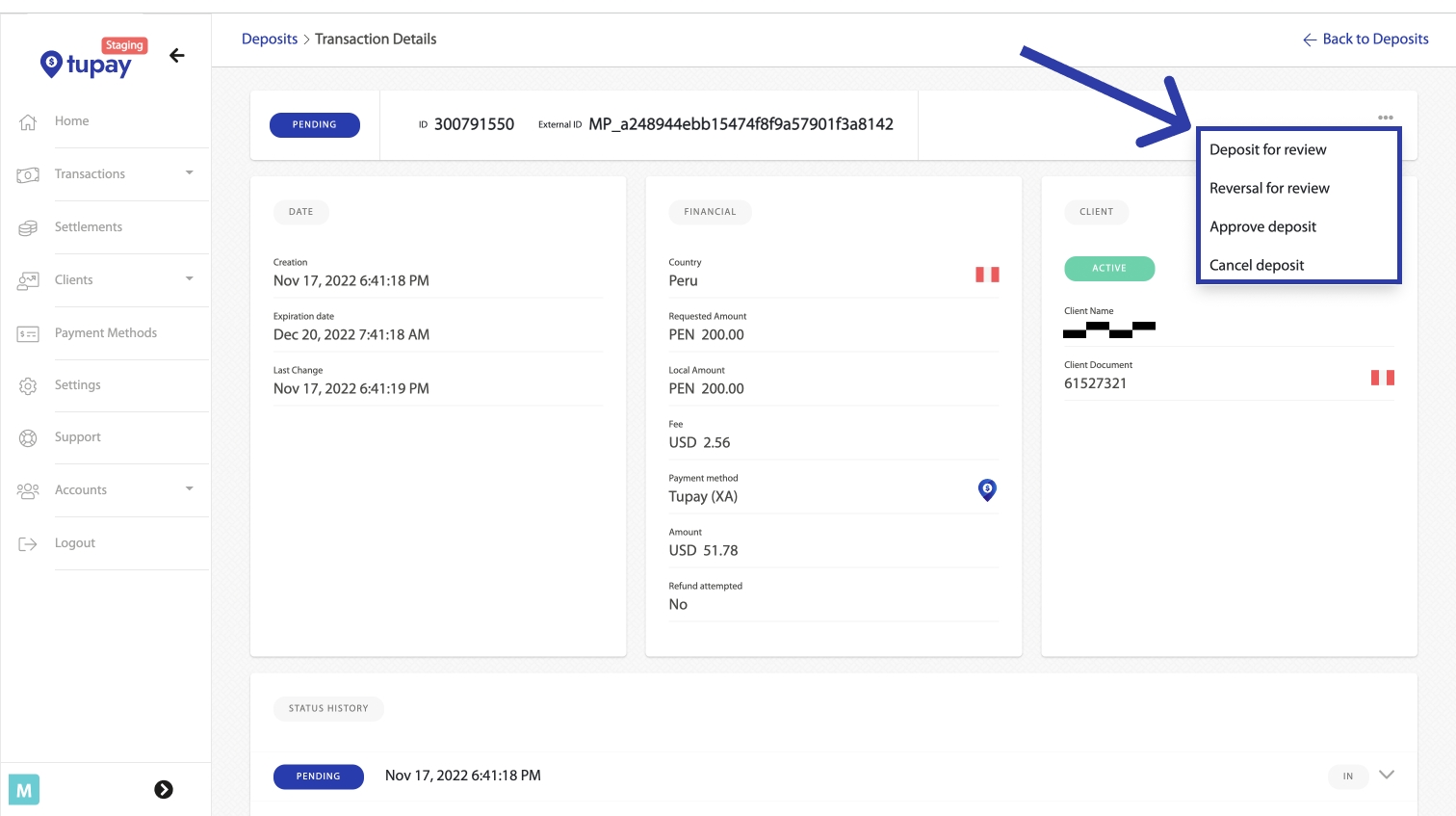 In the STG environment, in order to test the full flow you can manually set a deposit to COMPLETED / CANCELLED status by login into the STG Tupay Panel and going to Transactions -> Deposits. Those options will change the status of the deposit, therefore sending the respective notification to your notification_url